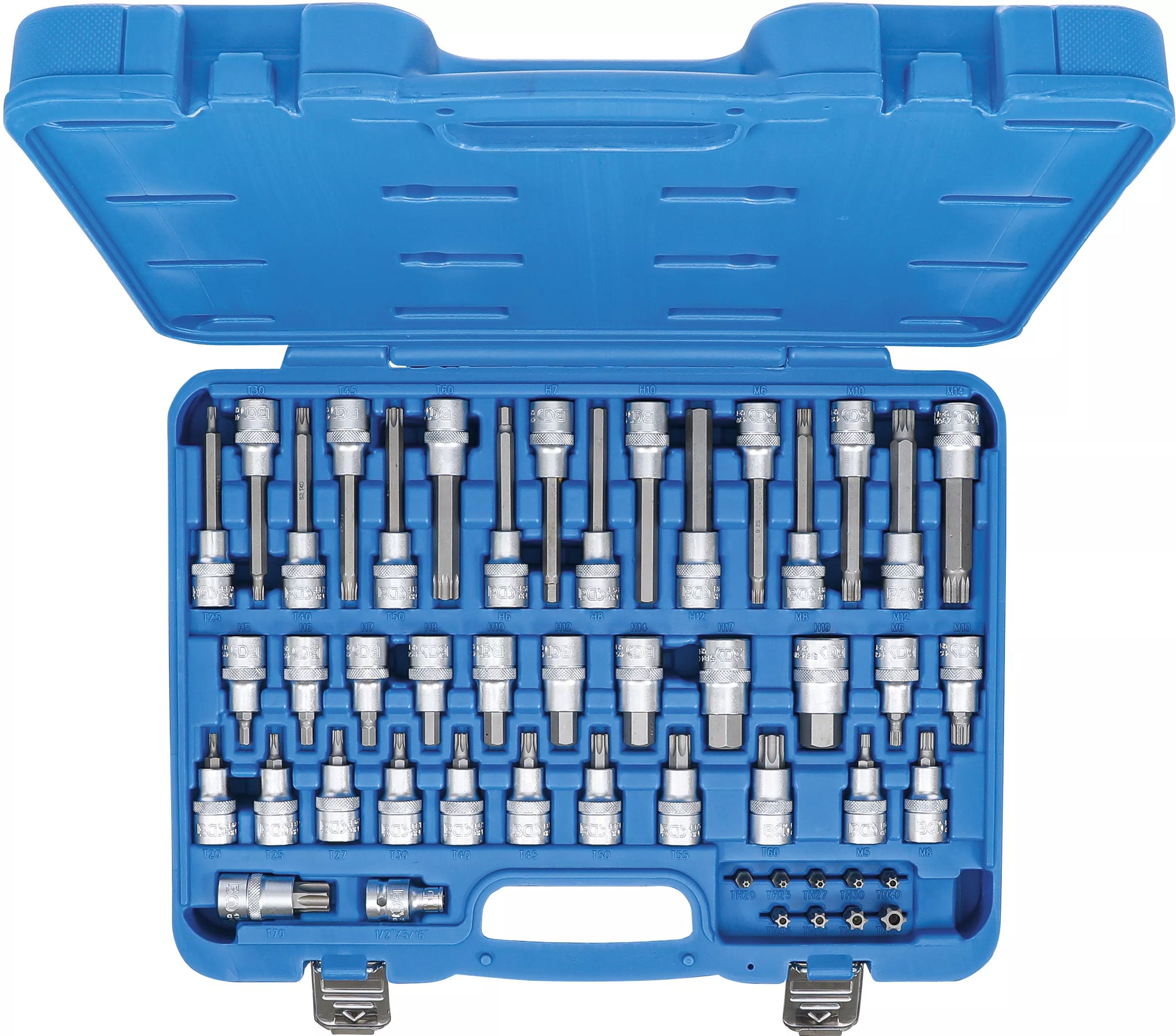 - 10 bithylsor, längd 55 mm, 12,5 mm (1/2"), T-Profil (för Torx): T20 - T25 - T27 - T30 - T40 - T45 - T50 - T55 - T60 - T70