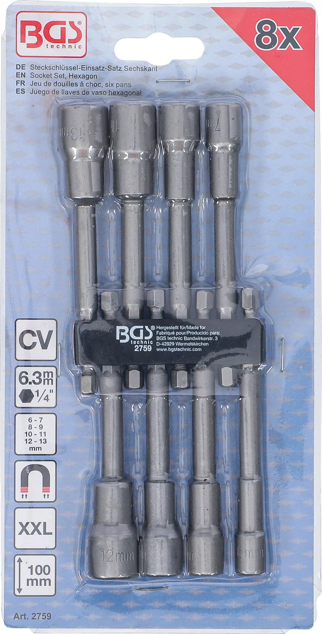 Hylsa-sats Sexkant | extra lång | Yttre sexkant 6,3 mm (1/4") | för Borrmaskiner | 6 - 13 mm | 8 delar. BGS 2759