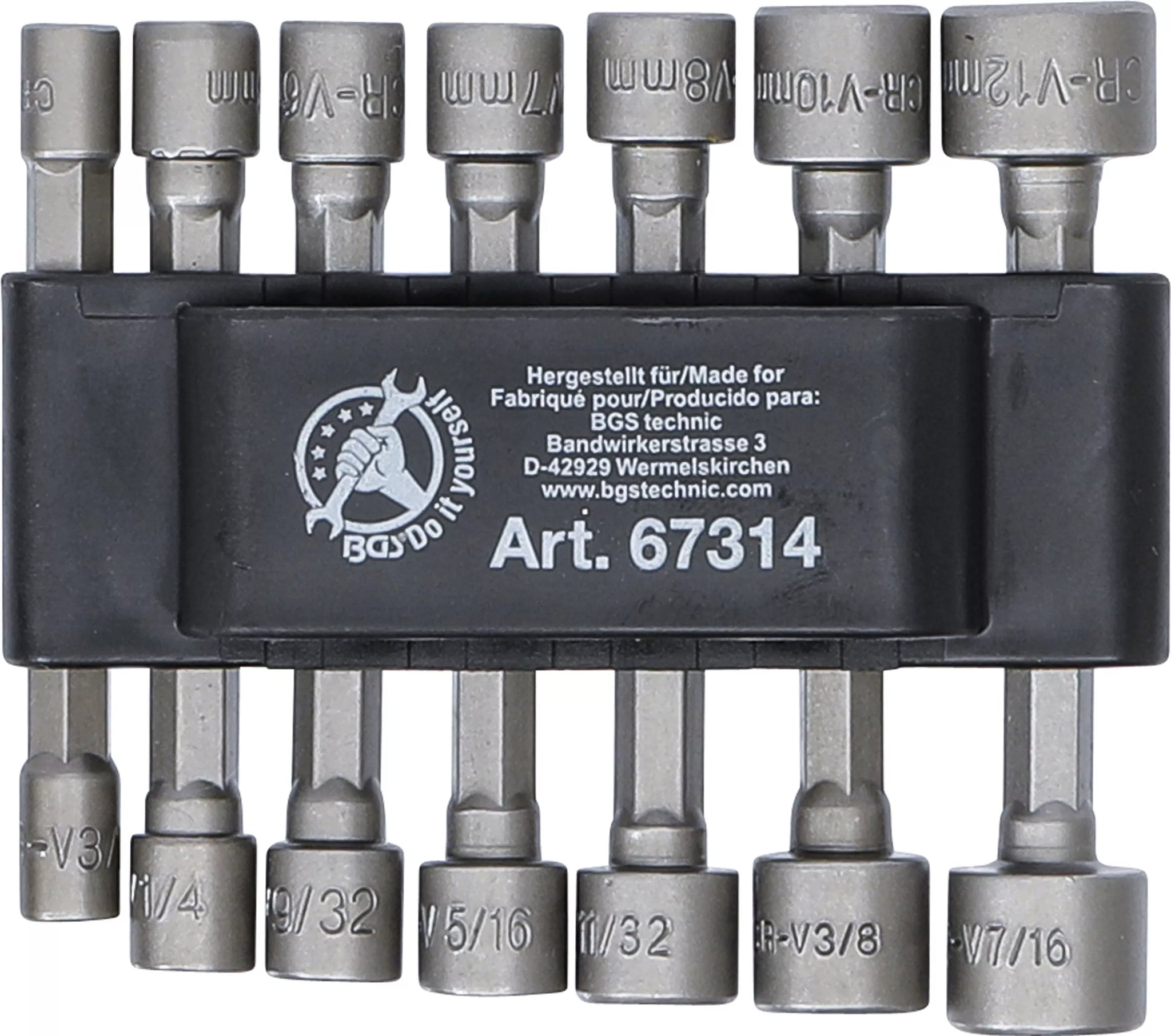 - 7 hylsor, yttre sexkant 6,3 mm (1/4"), sexkant 3/16" - 1/4" - 9/32" - 5/16" - 11/32" - 3/8" - 7/16"