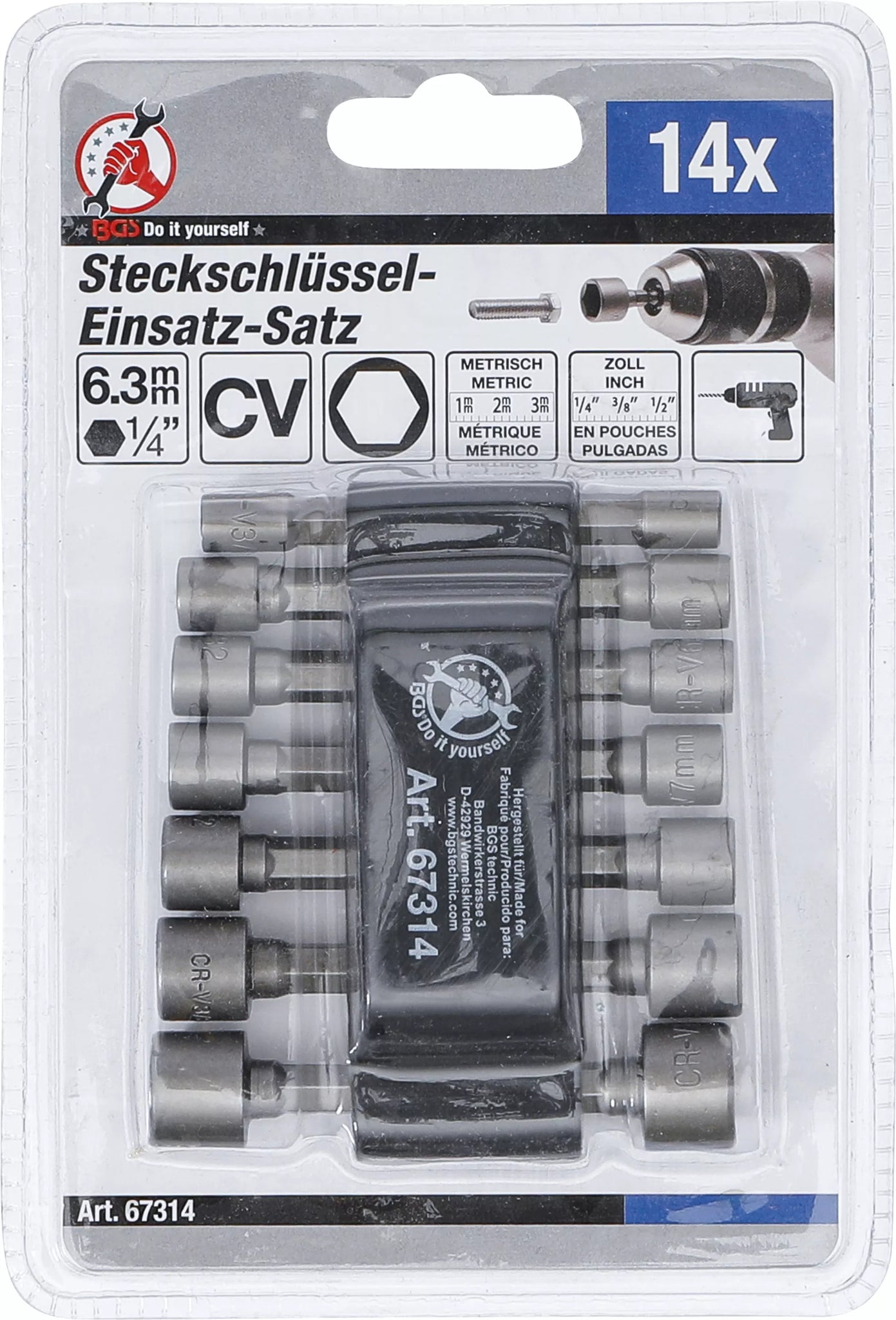 Hylsnyckel-/bitsats | Fäste yttre sexkant 6,3 mm (1/4") | Metrisk + Tum | 14 delar. BGS Diy 67314