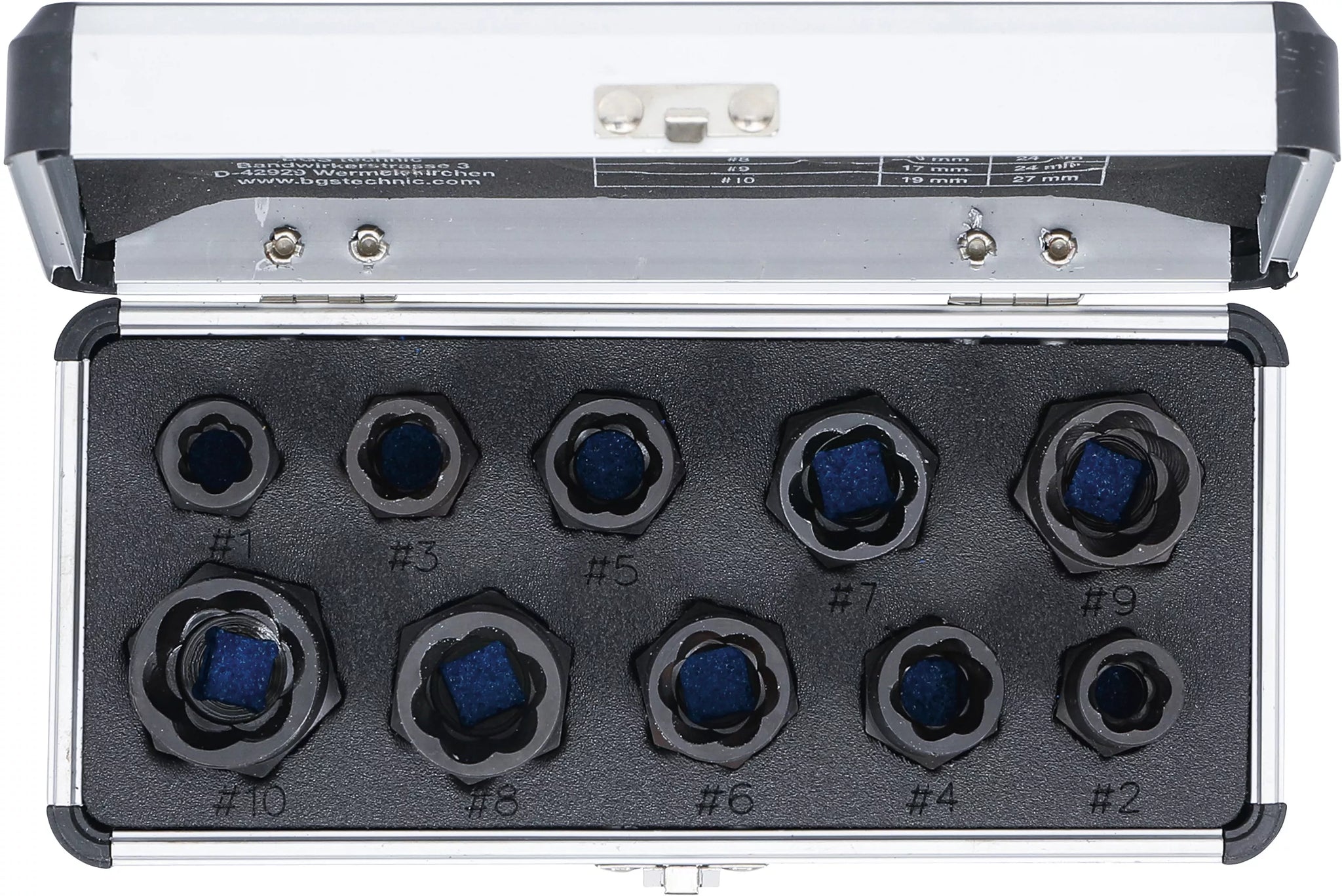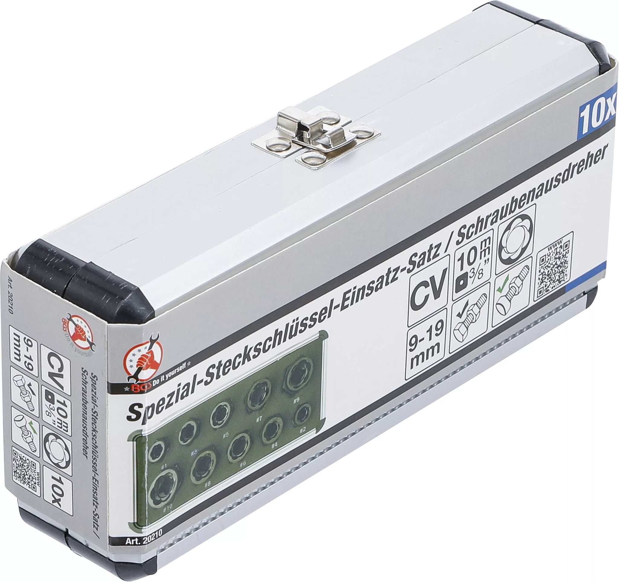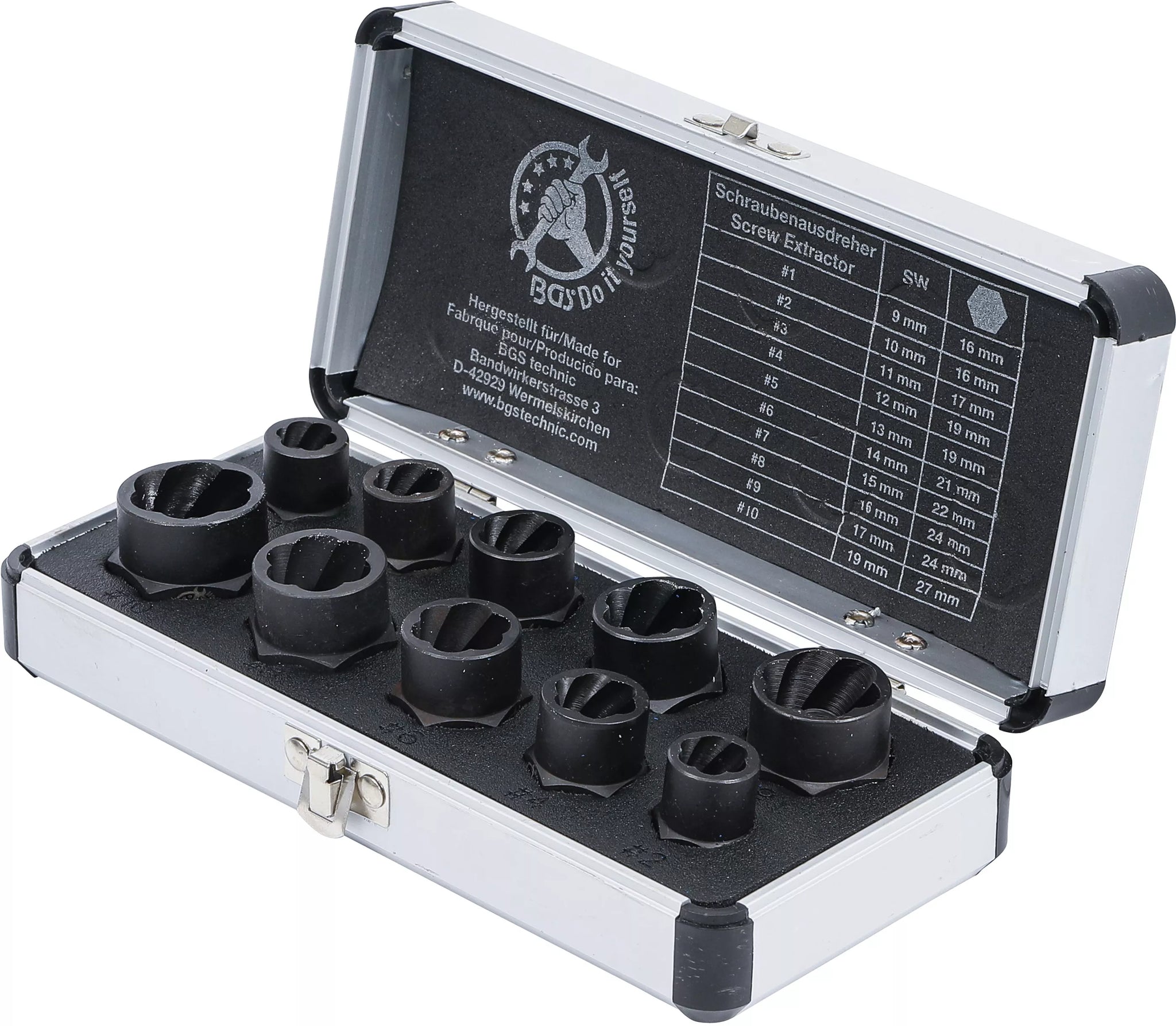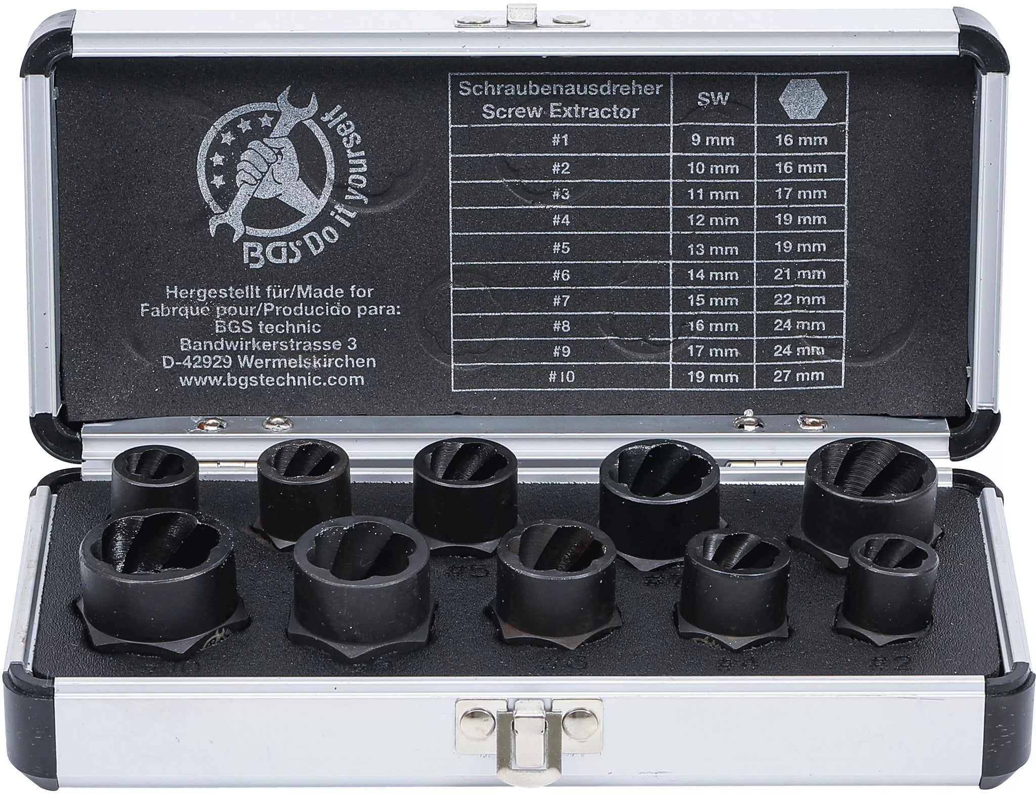 Spiralprofil-Hylsnyckel-sats / Skruvutdragare | 10 mm (3/8") / Yttre sexkant | 9 - 19 mm | 10 delar. BGS Diy 20210