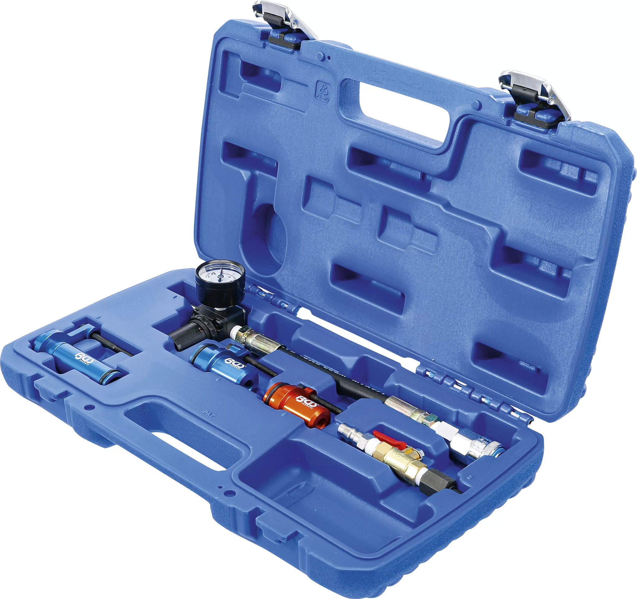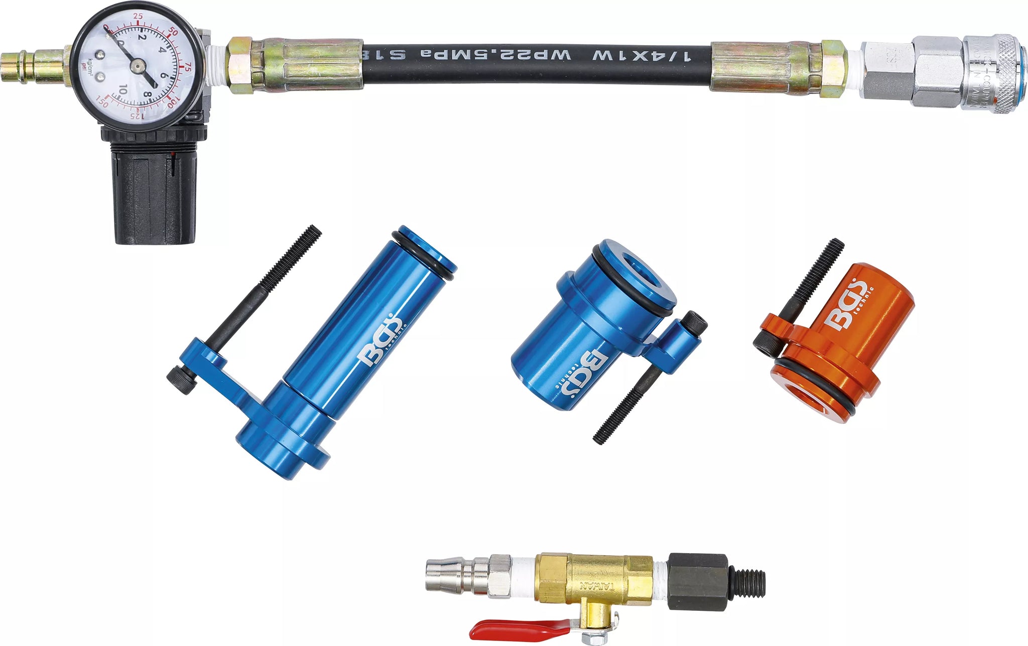 - Tryckluftsslang med snabbkoppling, tryckklocka och tryckregulator