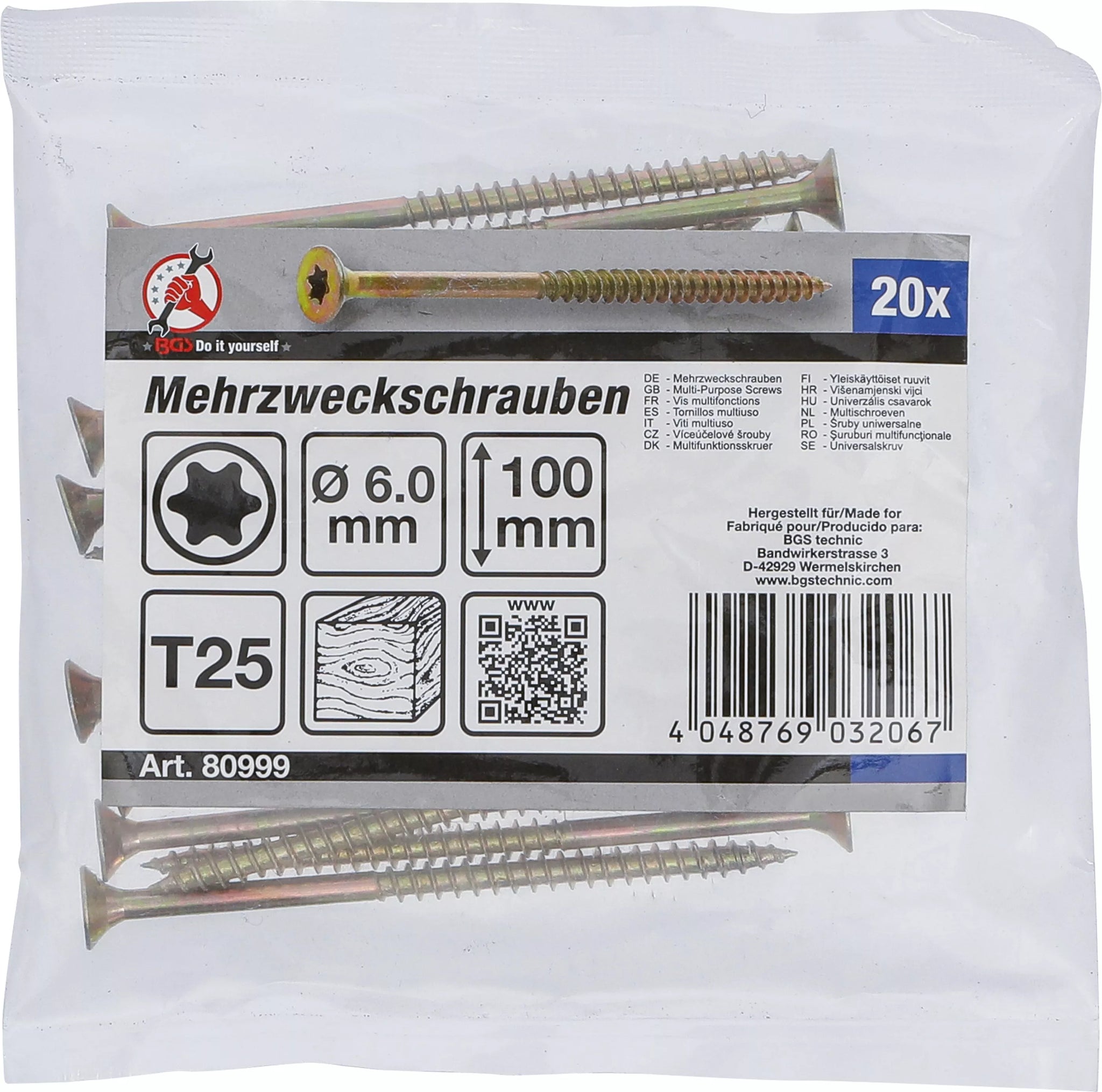Universalskruv | T-Profil (för Torx) T25 | 6,0 x 100 mm | 20 st.. BGS Diy 80999