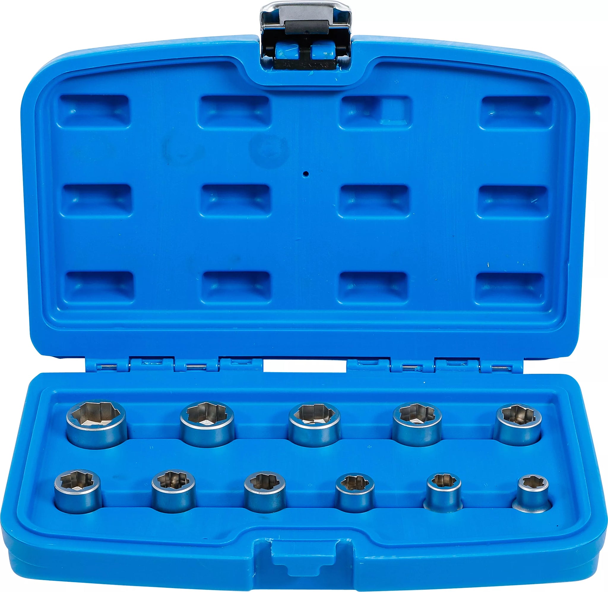 - Specialhylsor för att lossa fastsittande eller runddragna yttre sexkantskruvskallar och muttrar i storlekarna 8 - 9 - 10 - 11 - 12 - 13 - 14 - 15 - 16 - 17 - 19 mm (kan också användas för att spänna fast)