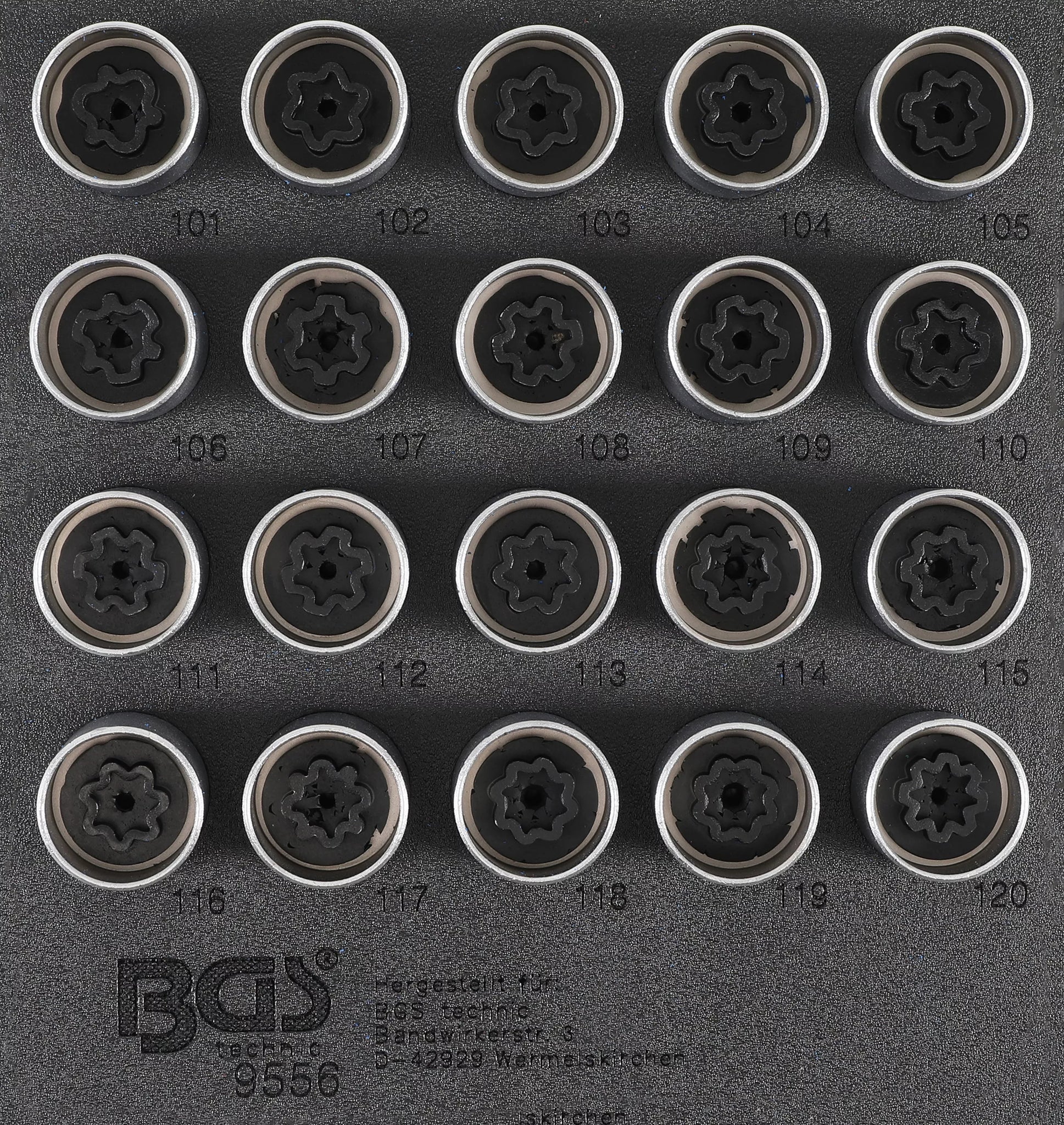 Verkstadsvagninlägg 1/6: Fälglås-Verktyg-sats för Opel (Typ A) | 20 delar. BGS 9556